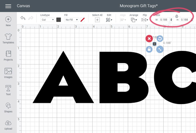 In order to use these letters as gift tags, I needed a hole in the top of each to string twine or ribbon through. To create these holes, start by click on the shape tool on the left menu, and draw a circle. I wanted the holes to be 3/16 of an inch, so I input .1875 as the circle size, which design space rounded to .188″ in diameter.