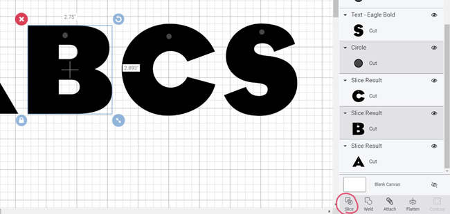 To turn these circles into holes that will be cut out of the letters, use the slice tool. Select both the number and circle layers, and then click “slice.”