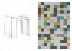 24" x 24" picture frames (matted to 11"x14") FAMILY ROOMYou had mentioned wanting a new side table by the couch, and a new rug in front of the chairs by the kitchen. I like these acrylic nesting tables because they don't take up any visual space. You can keep the tables together most of the time,but can separate them out if you need more table space when entertaining. The rug is in the same color tones as your current rug, but a bit more graphic. The grays in the rug would look good with the ... View the Post