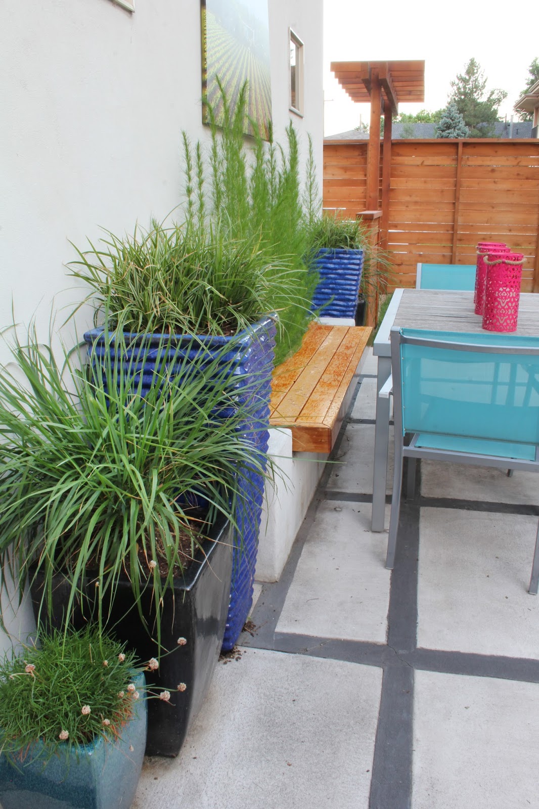 We’ve flanked both sides of the planter bench with large, colorful pots, and carefully selected plants that would also be soft for brushing up against as you take your seat at the table, and that wouldn’t attract too many bees to our dining area. The tall blue posts have Carax Ice Dance {a dense, spreading sedge that stays pretty short}. The middle, gray pots, are filled with a variety of feather reed grass that we chose for its soft, arching blades. And the small, teal pots are filled with Sea Thrift, a low clumpy grass-like foliage with thin stems that produce globes of bright pink flowers {which fade out, and are replaced with new blooms a few times each summer}.